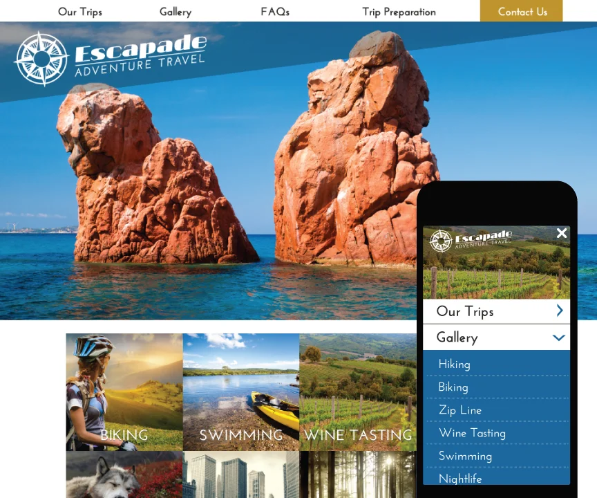 Escapade Adventure Travel was a fun concept that appealed to the 40+ adventure seekers. This site would allow you to view the upcoming tours and purchase from the site. The tours would have a planned itinerary with all the times and activities that would go on throughout the getaway. It was important to display beautiful photography to truly appeal to the audience.
